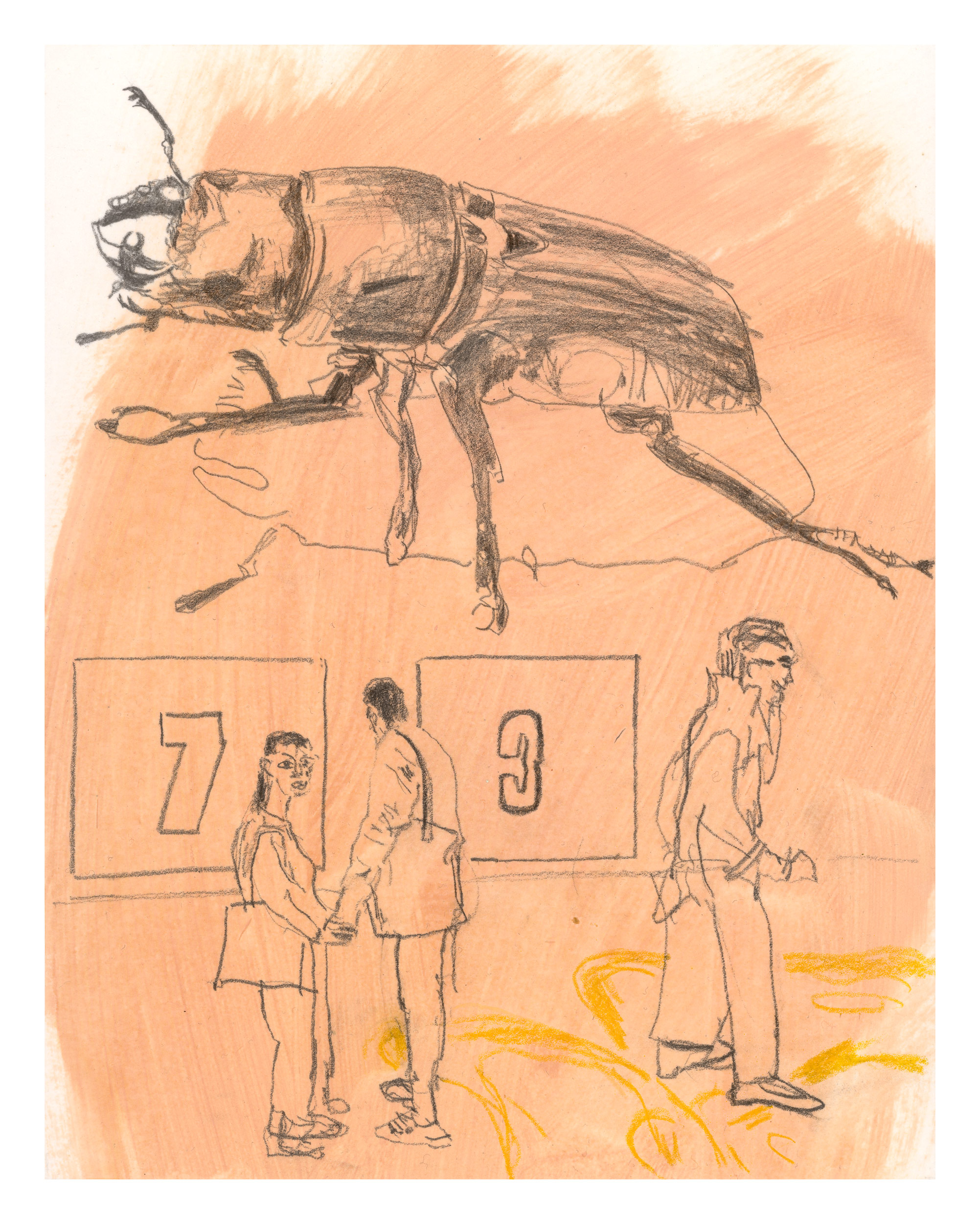 Isabel Pauer (geb. 1965, Meisterschülerin von Katharina Grosse, lebt in Berlin) zeichnet Momentaufnahmen als wären sie Filmstills: es gibt ein Zuvor und Danach. Jedes individuelle Erleben in der Gegenwart ist von Assoziationen mit Vergangenheit und projezierter Zukunft geprägt. Pauer bringt all dies gleichzeitig ins Bild und öffnet damit ihre Kompositionen in mehrere Richtungen. Die neuen exquisiten Drucke auf Hahnemühle, Sehen, was kommt und Vier Richtungen, basieren auf Pauers typischen Stiftzeichnungen auf Öl.